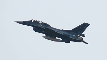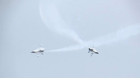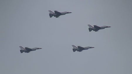 えっと、なんだっけ、ごめんなさい、古すぎますか?だいじょぶだいじょぶ〜・・・。いやだから、そうじゃなくて、はいごめんなさい、F-2は岐阜飛行開発実験団からです!ご近所さんがサンダーバーズの前でF-16系のヒコーキはこうやって飛ばすんじゃ!と見せつけてます!