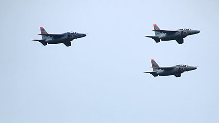 プログラムではT-4×6の機動飛行となっていたので楽しみにしていたのですが、残念ながら3機編隊での航過飛行となってしまいました。
