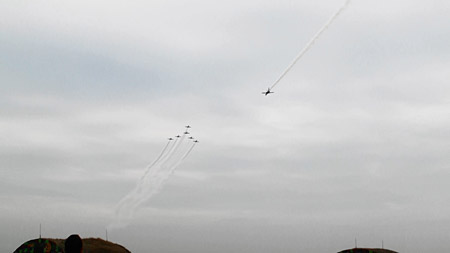 んっ!なんか、ばらばらっとなりましたよ!?デルタロール、編隊がバラけ気味ですがこのロールの苦手そうな機体で編隊全体は崩すことなく、個々で上手く吸収して綺麗なロールを打つ雷虎、かなりの技量を感じます!