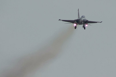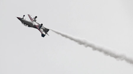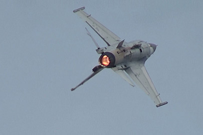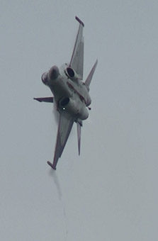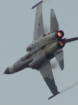 どーん。見た目、かなりパワフルに飛んでます。が。このフライトの様子をYoutubeにおいておいたところ、台湾先生の皆さんからは「パワー不足」の総評を戴いたようです。日本の皆さんからも。うーん、この日のミラージュとF-16が元気すぎましたからねえ。でもときどき、ぐぅ〜っとムリヤリ機首をまわしたり、なかなか軽快に飛んでましたよ。あの回頭はラプターっぽさも感じるぐらいでした。