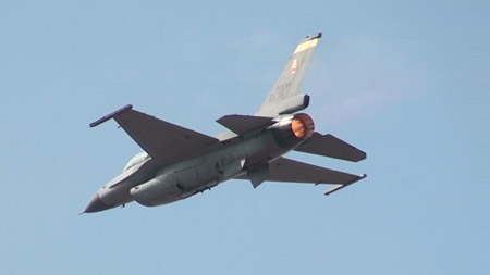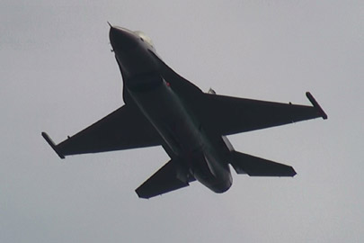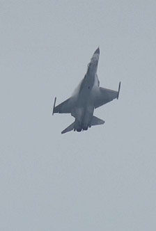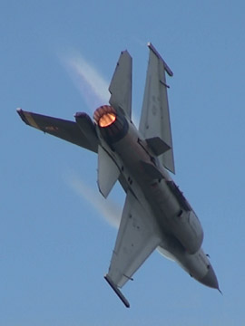 つづいてこの日一番元気だったデモ、F-16Aの登場です!どかーんとアフターバーナー全開で急上昇していきます!天気もよくなってきましたのでね、パワーに任せたムリヤリの機動を見せてくれます。