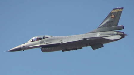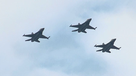 そうこうしてたらF-16編隊がどこからかやってきました。この日は、なんどかこうした戦闘機のフライバイも行われました。だいたい、時間通りにやってきます。一部を除いて。(笑)