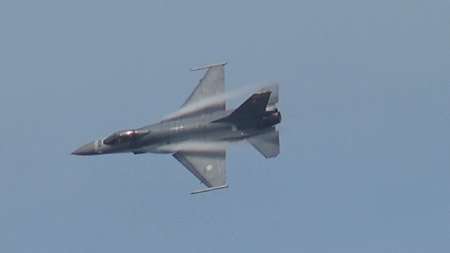 こんな状態、初めて見ました。米軍もヨーロッパも南米も、どこの国のF-16のデモでもこんな激しい状態は見たことがありません。ストレーキから出てるベイパーも左右で流れ方が違いますし、激しくスライドしてることが分かりますよね。
