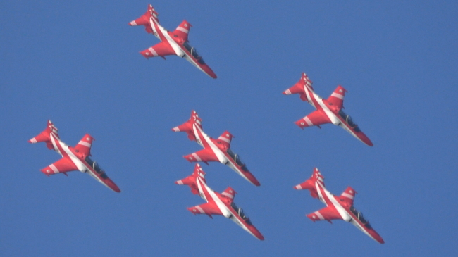 真っ赤なホーク。どっかで見た。そう。ご存知、英空軍レッドアローズ。スリヤキランも今回はまだ6機でスモークなしでしたが、今後本来の9機に拡大、そしてスモークももちろん使う予定です。このホークが9機になったら完全にレッドアローズだなあ。。。(笑)