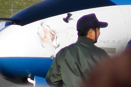 噂によると鳥が当たったのだとか。うわ、ほんとだ。。。すごいなこれ;;三沢のときはインテークが「べっこり」で済んでましたが、今回はなんか外板に穴あいてちょっと剥がれちゃったね;;