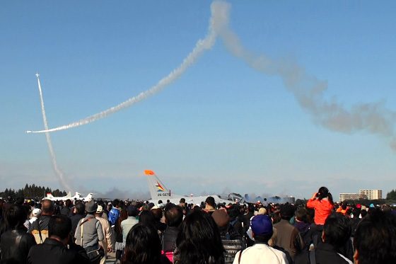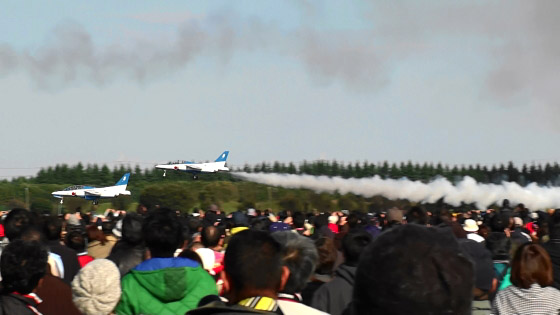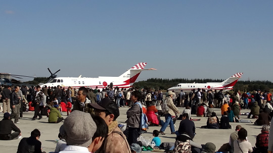 そしていよいよやってきました、ブルーインパルスの時間です!…うわあ。この時間になるとやっぱりこの満員状態。。。どひゃあ。。。これが噂に聞いた入間のエプロン。。。ついにこの目で確かめたぞ!すんごいですね;;