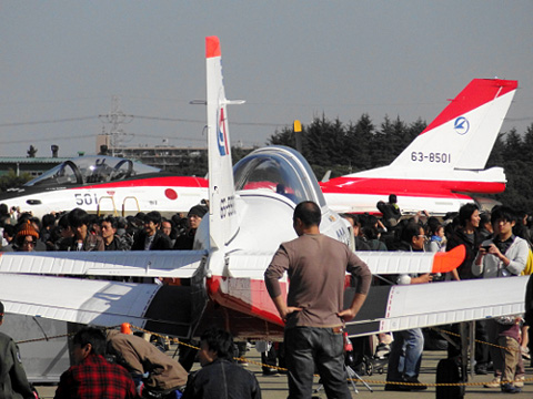 紅白のヒコーキ2機。空自パイロットが初めて乗るT-7と、空自でも屈指のテストパイロットが乗るXF-2。