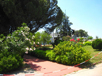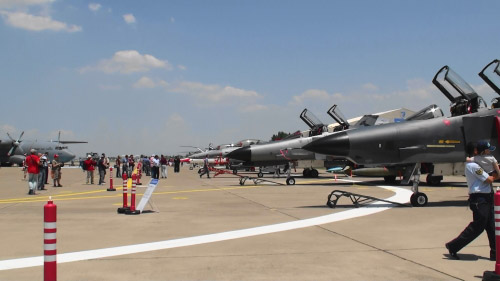 さあ、本日は地上展示も見られるということで、そっちのエリアに歩いていってみましょう。基地の施設。緑が豊かです。途中でオフィシャルっぽいカメラクルーにでっかいカメラ向けられた。ビデオソフトとかになったら写りこんでるかな。東洋からのお客さん、ほかにあんまり見なかったもんね。彼らにも貴重なサンプルだったことでしょう。(笑