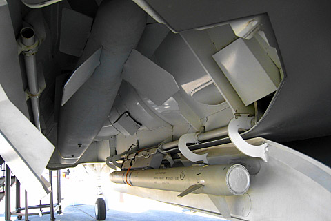 機体の下に潜れました。左側のウェポンベイにはなんかヨーロッパ系?のミサイルと爆弾が。いろいろ積めちゃうんだぜ。のデモかな。これ、ASM-2とか入るかな。右に空対空ミサイル、左にASM-2で対艦戦闘できるんでは??