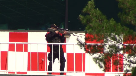 管制塔ではなんか凄い人が警備していました。ダメだよ、銃構えたりしたら;;ワタクシが下からビデオカメラでシュートしてるのに気づかないんだから、なかなか無防備ですな。撃っちゃうぞ。ばきゅーん。