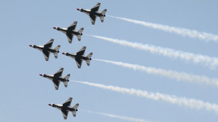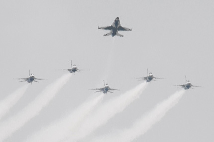 真正面からトレイルで。F-16×6で派手に会場を飛び回るサンダーバーズの迫力は、やっぱり欧州7チームと比べても圧倒的でした。