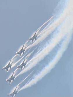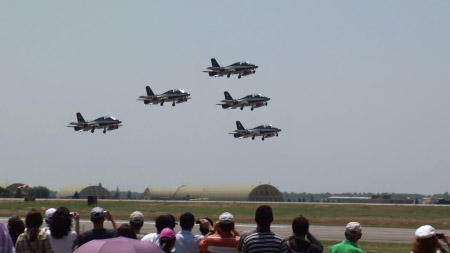 あ、ふれっちぇの最後のブレイクって初めて見たなあ。普通は、一個前の画像のパスのあと、そのまま右から編隊着陸するのですが、今回は左からの着陸のせいか、こういうことになっています。2個の編隊でそのまま進入、ピッチアウトしていくので圧巻でした。