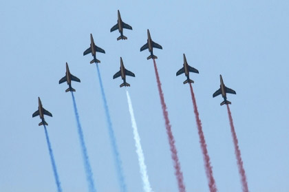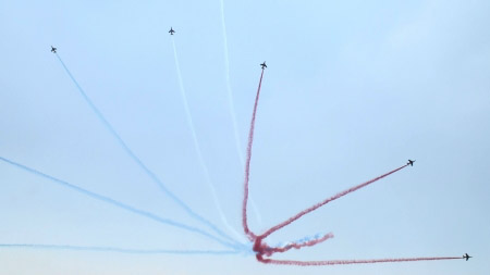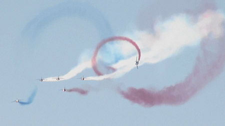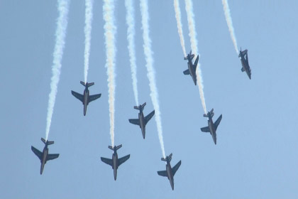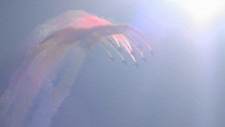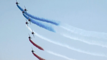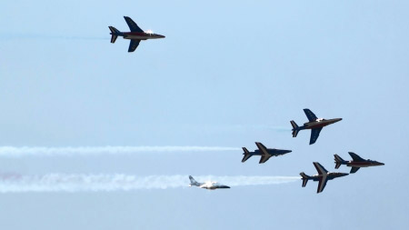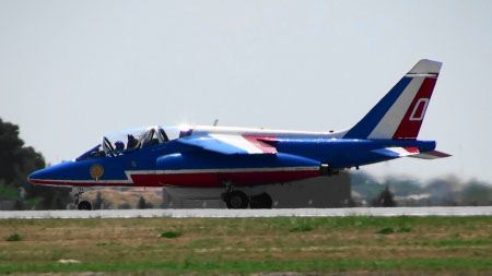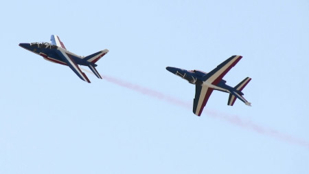 アルファジェット8機のアクロです、おフランスは課目間のつながりも綺麗です。隊形変換しながら回ってきたり。