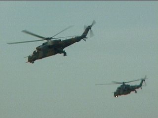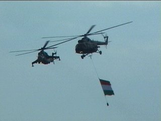 オープニングスタート!ハンガリー国旗をさげてやってきたのは・・・うっわ。だってほら、なにこのヘリ編隊。Mi-8とかMi-24とかいっちゃうんだろうなあ。
