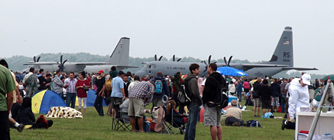 さてさて、霧の影響でなかなかフライトが始まりませんが、戻ってみましょう。あちらにC-130とC-27。人がわんさか。白い空ですなあ。