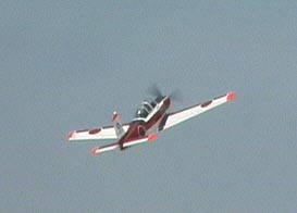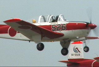 さて、T−3二度目の展示飛行です!えーと。デジタルズームのため荒れておりますが・・・性懲りもなくまたでてきました、くまのぷーさん!今度はちょっと右に顔を向けています。キャノピーフレームに手を掛けて余裕の姿勢を見せています。前のシートのポケットに安全のしおりとゲロ袋、機内誌が用意されているのは確認しましたか?緊急の際はシートの下から救命胴衣を取り出しましょう。あなたと同じ黄色ですよ。