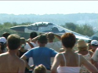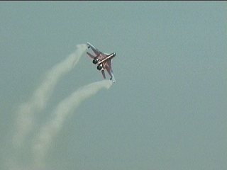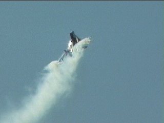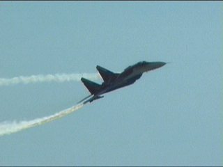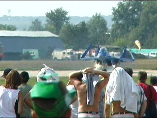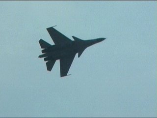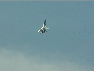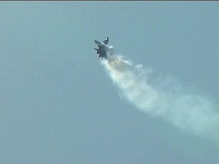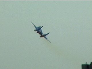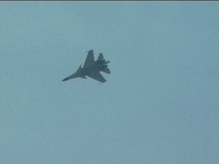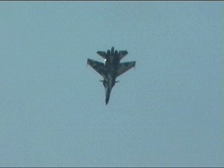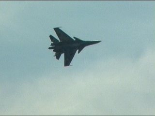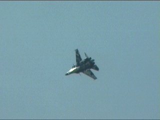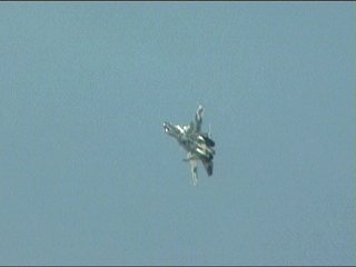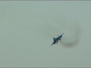 うおー!マジでフランカーだ!!フランカーが目の前で機動してる!しかもボクらのカナード付きだ!(爆笑)昨年中国でドタキャンされたフランカー、パリに不参加フランカー、RIATで肩すかしを食らったフランカー、ついさっき入場遅れで遠巻きにしか見れなかったフランカー・・・。やっと、やっと、やっっっっっっと目の前で凄いデモを見ることが出来る!!めっちゃ感動〜♪