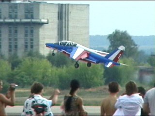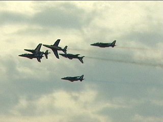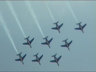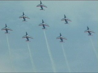リーダー以外の7機が背面になる“ミズ・ドゥー”と呼ばれる課目。外翼2機とスロット、内翼2機、後端2機の順にロールし、最終的にこの隊形となります。広めの隊形で背面になった後に徐々に詰めて行くブルーの背面編隊との違いは、はじめからこの密集状態で背面に持っていくこと。機軸を中心としたロールのキレが抜群だからこそなせる技だとか。現在の使用機はご存じ、アルファジェット。T-4と尖らせたような形してますね。この手の機体は操縦性も素直で非常にアクロ向きだというのが伺えます。