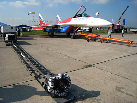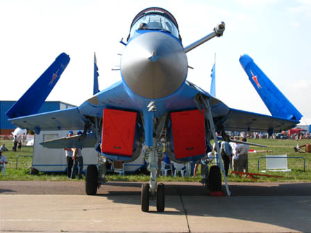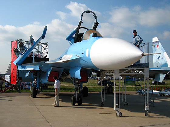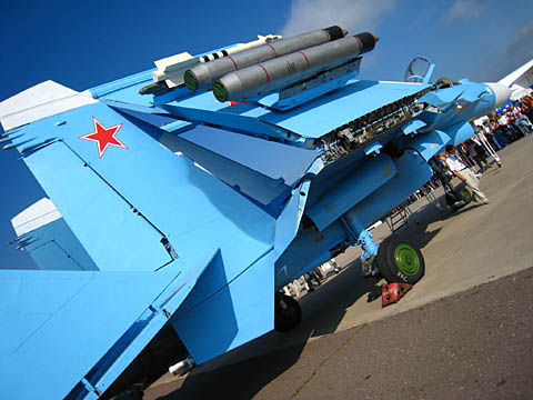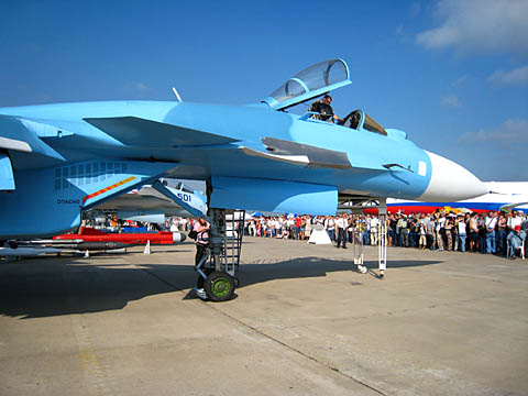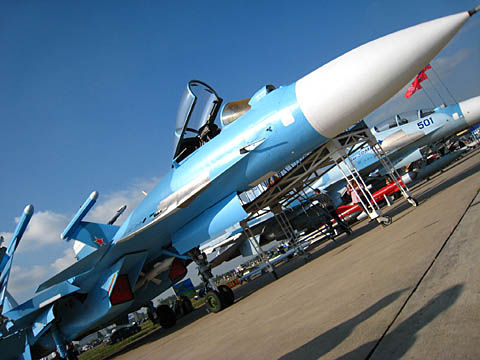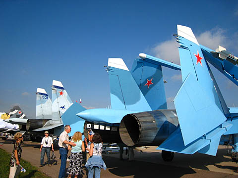 うーわ、強そう…そういえばMAKSに空自とか防衛省のプロのみなさんも来たりするのでしょうか。そらショーで見るだけでは実体までは分からないでしょうけど、こういうものだ〜と敵の現物を見ておくって事はないのかな…いまどきショーじゃなくても見れるのかな。いんや、なんの手続きもなく気楽に見れるのはやっぱりショーだけ!・・・10年ほど前に空自のパイロットもフランカー操縦してるんですけどね…まさにこの辺で。