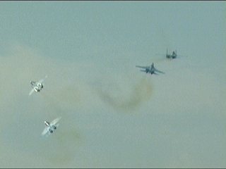 クロス!こんだけ近い距離で狙われてたらミサイルで撃たれるとかガンで撃たれるとか以前に、追突されそうで怖いですよね。急ブレーキ禁物です。みなさん大好きな「コブラでオーバーシュートさせて…」なんてやったら背中に後続機が突き刺さります。