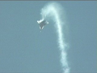 これ、ループだと思うでしょ?違うんだこれが。ここからこの機体は横転します。ロールじゃありません。側転か?背中をこっちに向けたままスピンですな。ありえなくな〜い?(笑)