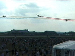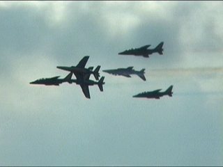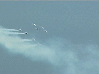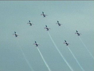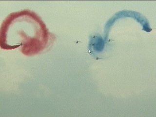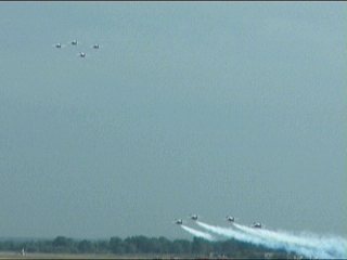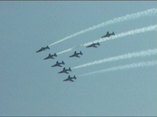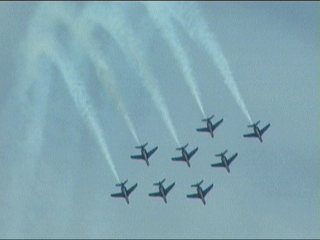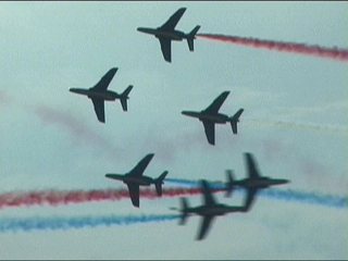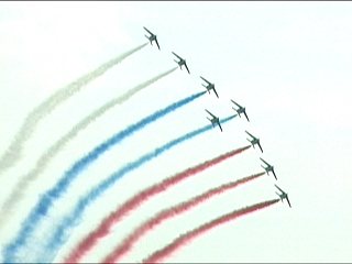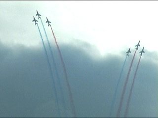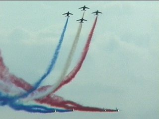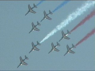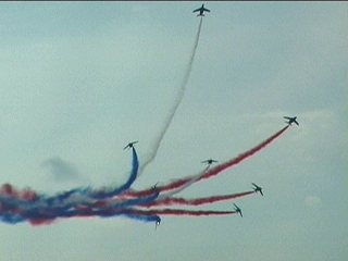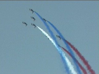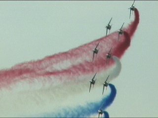 まずはフランス国旗で行って下さい。ヨーロッパ系はだいたいみんなカラースモークですが、色がブルーインパルスのパステル調とは違って原色系ですよね。またブルーのカラースモークも見たいなあ。