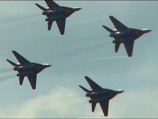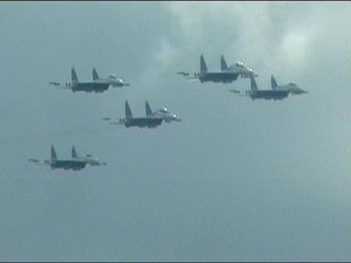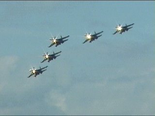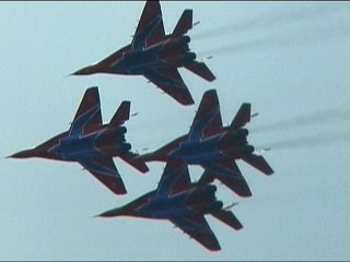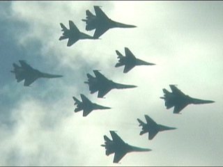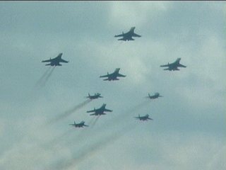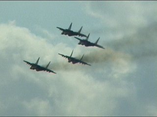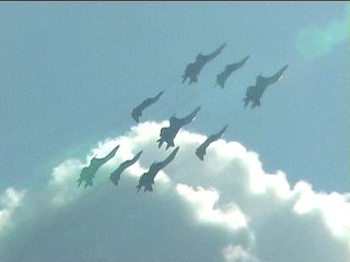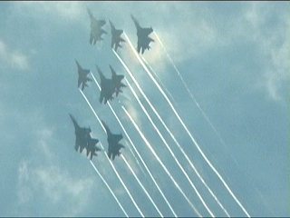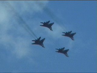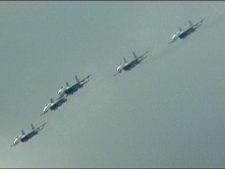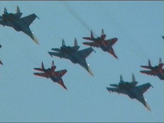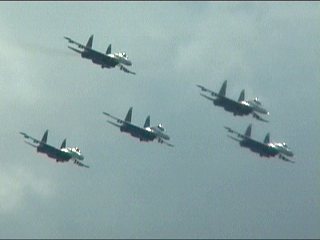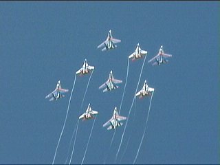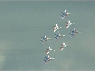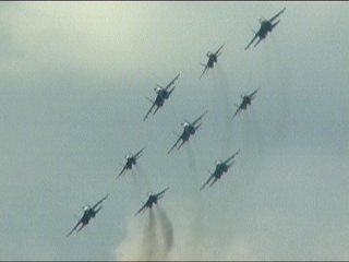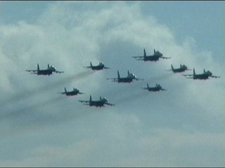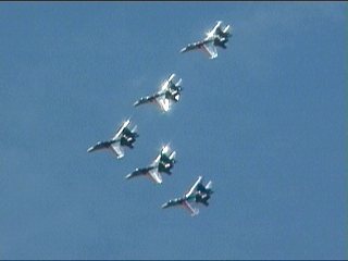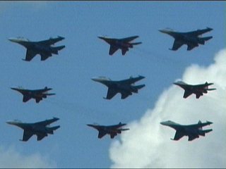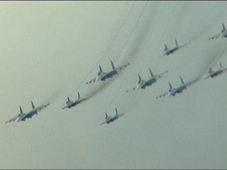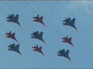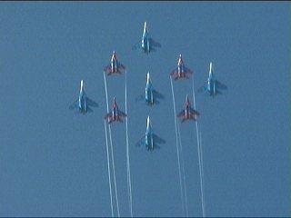 ルスキーイェビチャジ(Su-27×5)+ストリジィ(MiG-29×4)、混成編隊!派手だなあ。贅沢だなあ。