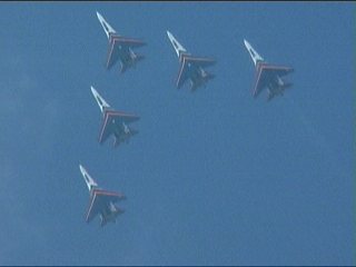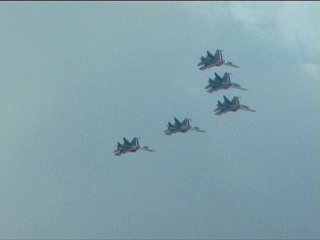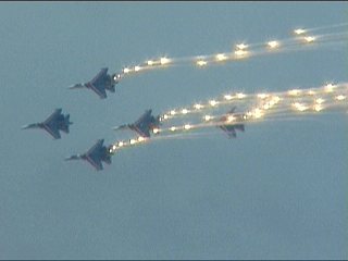 ロシアンナイツのフライトプログラム、よーく見ると同じ課目の繰り返しなんです。でもSu-27×5での編隊アクロってだけで凄いです。