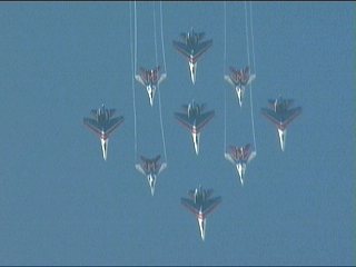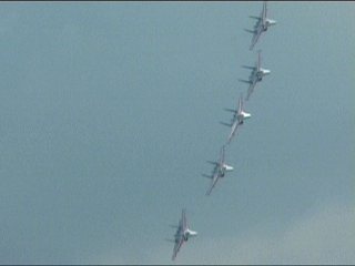けっこう主翼端が重なる位置なんですよね。機体が大きい=編隊も大きい=中心と外翼で動きがぜんぜん違う、慣性力もおおきくなるというわけで、できるだけ小さい編隊を組んだ方がアクロには好都合なんでしょうね。ロールなんて右翼機と左翼機ではぜんぜん動きが違うはずです。