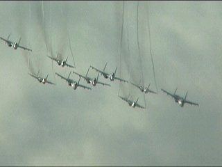 ほら、なんかたくさんいるよ。マンガとかでときどき見かける。戦場上空まで多数機密集編隊で飛んでくる戦闘機。
