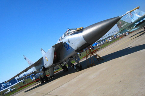MiG-31。まだ飛んでるところは見たことない。MiG-25もね。形状的にはF-15をすっきりというか古臭くさせた感じ;