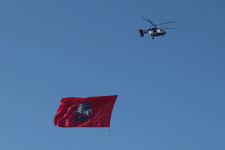オープニングでーす。旗をたなびかせ、かわいいヘリがやってきました。