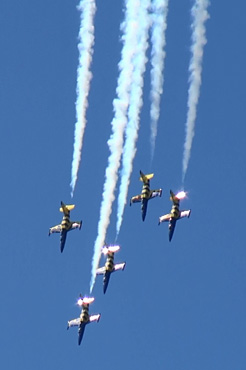 それにしてもL-39を使っている民間チームって多いですよね。有名なところではフランスのブライトリングジェットチーム、アメリカのペィトリオッツってのもいますし、ロシアの半官半民みたいな“ルス”(いまは民間?)、などなど。うーん。ジェット練習機を複数運用できる民間組織って凄いなあ。
