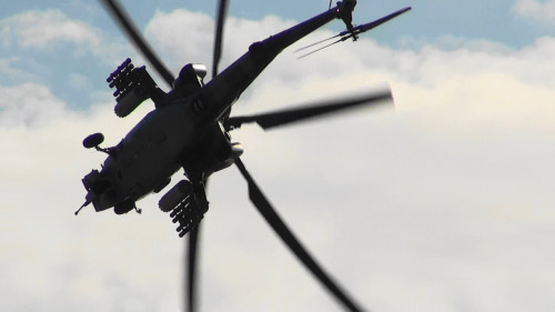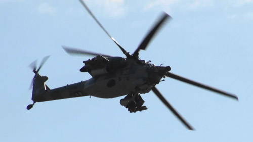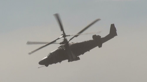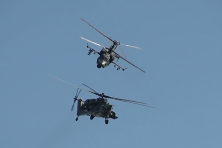 Mi-28も飛んでいます。別々の種類の戦闘ヘリで同時に模擬戦、贅沢です。