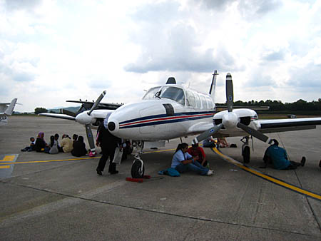 みなさん、飛行機の下で日差しを避けてます。ワタクシも格納庫の影とかで涼んでました。だって暑いんだもん。