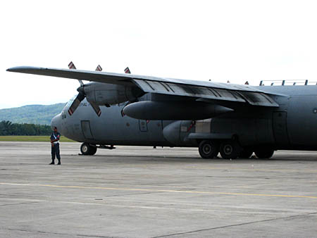C-130、でかいですね。あっちの方は山。東南アジアらしいよねえ。