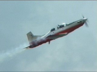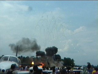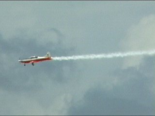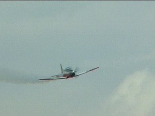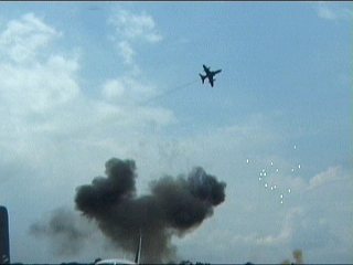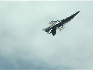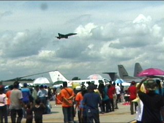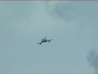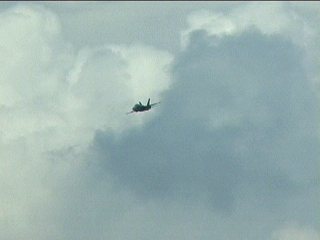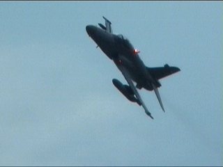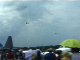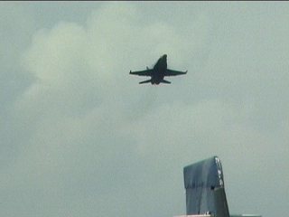 これ、高AOAやってるように見えます。ごめん、ビデオからのキャプチャだから画質悪くてよく見えないけど・・・ストレーキからすごいボーテックスでてるの。つまり、思い切り引き起こした瞬間。観客に向かって突っ込んできて正面で急上昇!!ってなフライトでした。