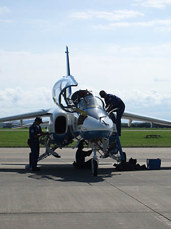 ってあまりにもふつうに感想書いちゃダメですか。(笑) 展示機ではないのですが、会場の隅の方に固めてT-2が置かれていました。その中の1機はブルーインパルス仕様機です。今はT-2B.I.デビュー当時のような出で立ちで保存されているんですね。その横には退役記念スペシャルマーキングも。そのまま保存されていたんですね。よく見える場所が立ち入り禁止になっていたので残念ながら撮れませんでした。(ロープくぐって撮りに行ってるおっさんたちがいましたが。)他にも何機か置かれていました。どうせなら1つぐらい地上展示に出してくれたらよかったのにぃ。