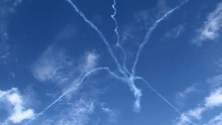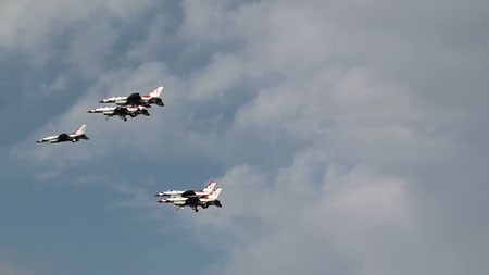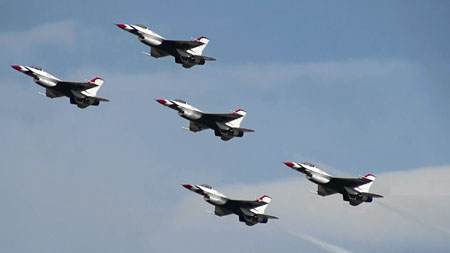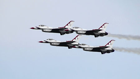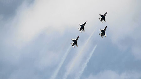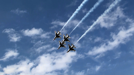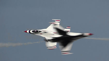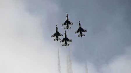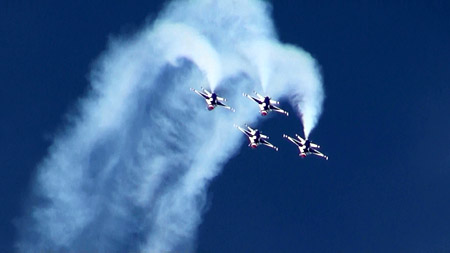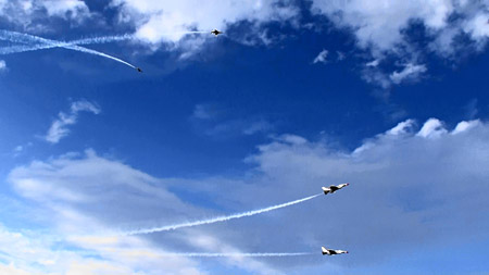 で、上の空中開花のあと4点交差を見せ、バラバラになりますがそのまま一気にジョインナップします。実はバーズのフライトの中で一番凄いのはこのジョインナップじゃないかと思うぐらい。4方向に散らばった機体が極々短時間でまた編隊に戻るんです。ブロック52になって、その時間がさらに短縮されました。