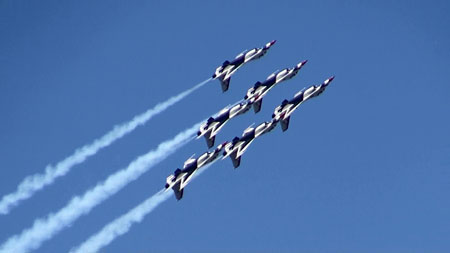 6機揃うとカッコイイ!バーズの編隊はブルーズに比べてフラットです。そのため、各機の間隔はブルーズより若干開いて見えます。「そんなに離れてて見失わないの?」とかってブルーズがバカにするんです。アホくさ。(笑)