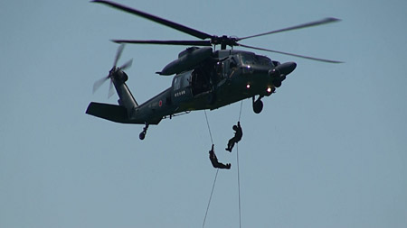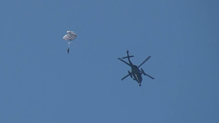 途中下車!パラシュートで降りたり、ラペリング降下したり、救難はあらゆる手段を尽くして人を守ります。大変なお仕事です。