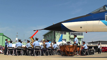 今回はブルーインパルス50周年の特別演出がありました。ブルーインパルスのウォークダウン時のBGMを航空中央音楽隊が生演奏です!列線とは離れたところですが、T-4と先代T-2のブルー仕様機が並べられたその場所で、The Simmer of the Air
