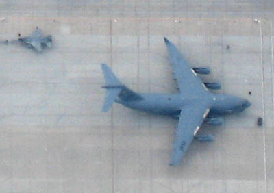 お、C-17、さすがにでかいですね!隣のF-16やたぶん人間と思われる染みと見比べるとよく分かります。