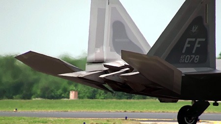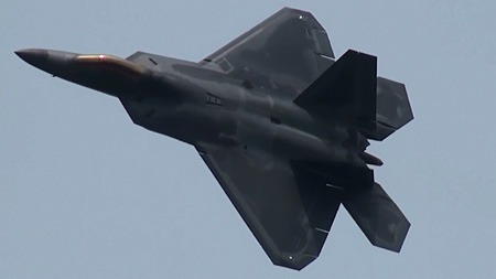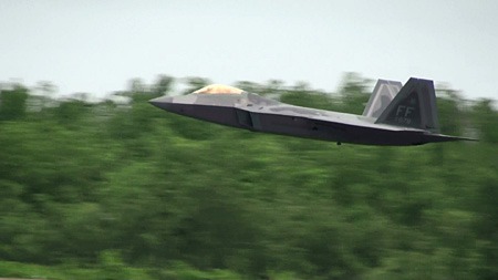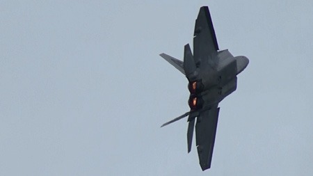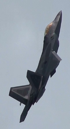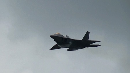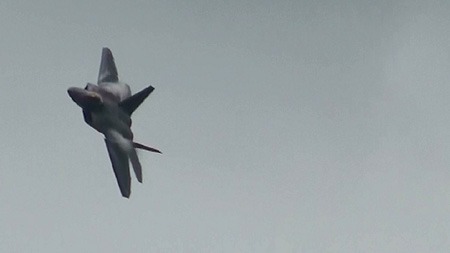 って、なんの話をしてんだか。F-22が高速でやってきます。この機体、相変わらずベイパーが出やすいようです。