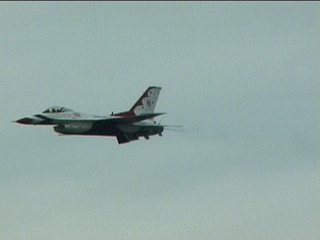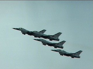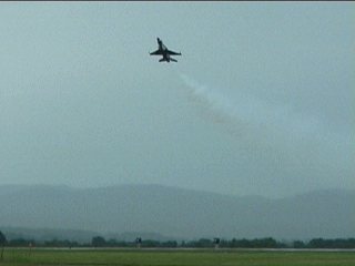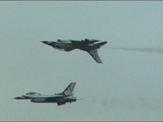 はい、来ました。見ての通り画面が白いです。大雨降っています。その中で元気いっぱい飛び回っています、サンダーバーズ。いやほんと、こりゃヤバイってぐらいの大粒シャワーで途中で撮影放棄したもん。なのに飛んでるの。お客さんだって傘さすのに必死で誰も見てなかったのに。(笑)