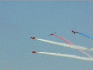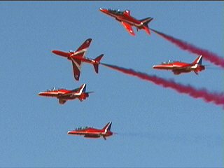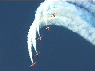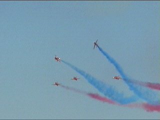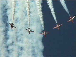 これまた変な課目、Roll Backs。5機のデルタから真ん中の2機が上昇してロール、外側へ。ブルーのロールバックトゥアローヘッドに似てますが、もっと何回もロールバックします。