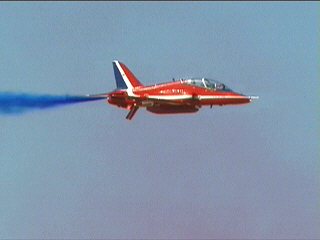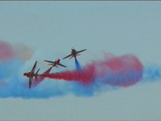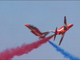 さらにもう一度目の前でクロス!赤、白、青のスモークを切り替えながら出すことができます。クロスの瞬間にスモークの色が変わるの!複雑な機動の割に課目名は意外にシンプル、Cycloneでした。
