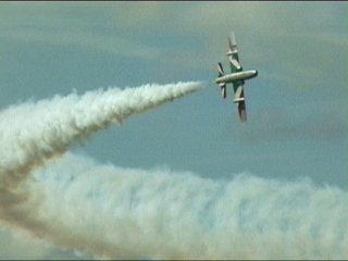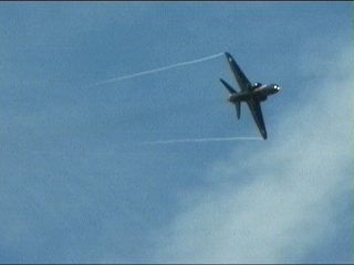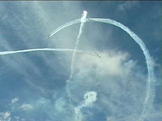 なにがなんだかわからない画像になっています。ソリスタがジェット機ではやってはいけない機動をしちゃった直後に編隊がそれぞれループとロール…