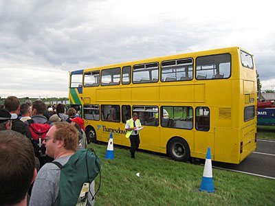 帰りのバス。黄色い二階建てバスが来ました。今年もこれでスウィンドンの駅と会場を結んでいました♪