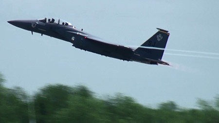 凄い勢いでストライクイーグルが降りてきます。どうせないらランターンとかスナイパーとかそういうポッドも付けてデモってくれればなあ。